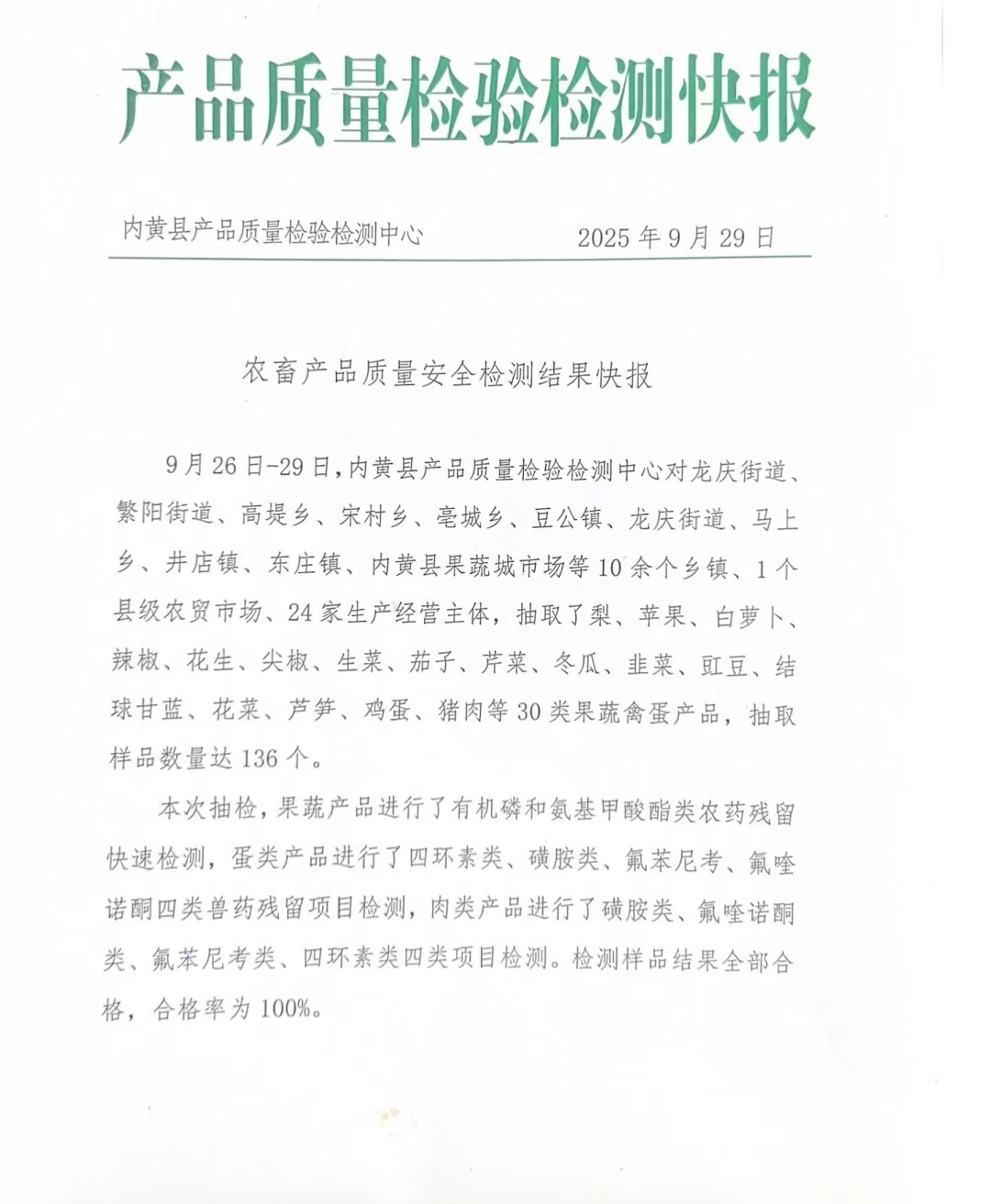 本次抽检,涉及现有产品上市的高堤乡、宋村乡、亳城乡、豆公镇、龙庆街道、马上乡、井店镇、内黄县果蔬城市场等10余个乡镇、1个县级农贸市场、24家生产经营主体,抽检品种覆盖梨、白萝卜、辣椒、花生、尖椒、生菜、茄子、芹菜、冬瓜、苹果、韭菜、豇豆、线椒、圆椒、结球甘蓝、花菜、芦笋、菜椒、鸡蛋、猪肉等30类果蔬禽蛋产品,共计检测样品达136个。